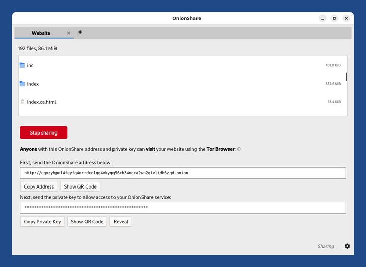 Con il servizio Sito Web di OnionShare: