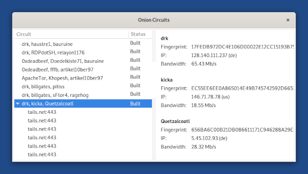 Each Tor circuit is made of 3 Tor relays. In the example above, the connection to tails.net goes through the 3 relays drk, kicka, and Quetzalcoatl.