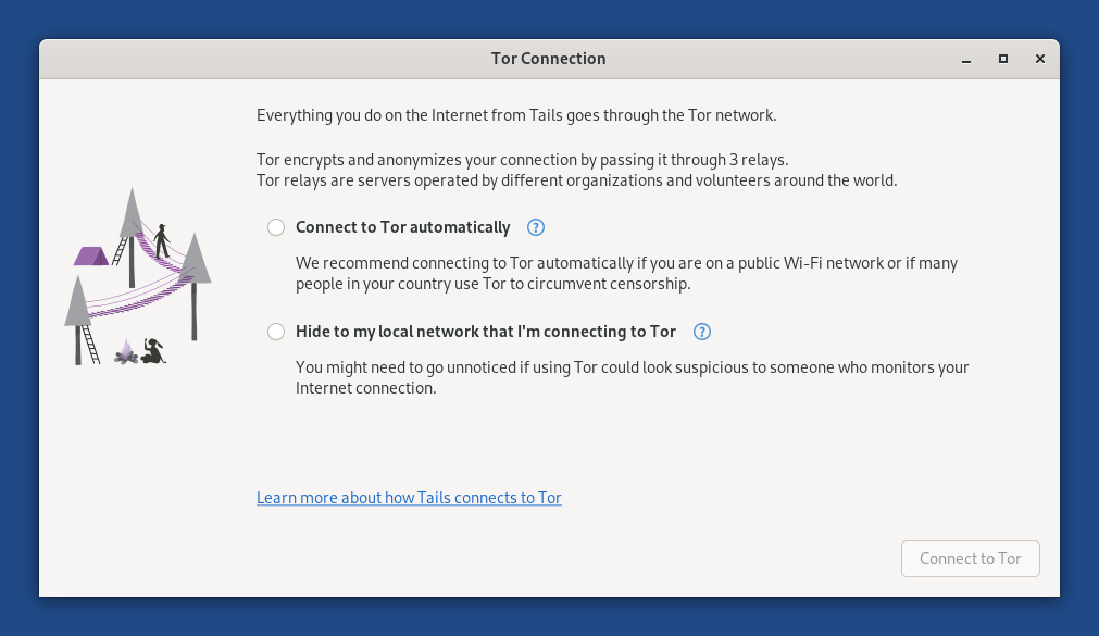 When you choose this option, Tails will only connect to Tor after you configure a custom Tor bridge. Bridges are secret Tor relays that hide that you are connecting to Tor.