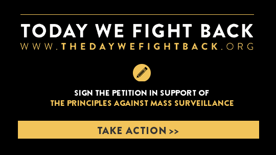 Today we fight back 2014-02-11 "The day we fight back" is a day of protest against mass surveillance. It asks legislators to oppose the FISA Improvements Act, support the USA Freedom Act, and enact protections for non-Americans.